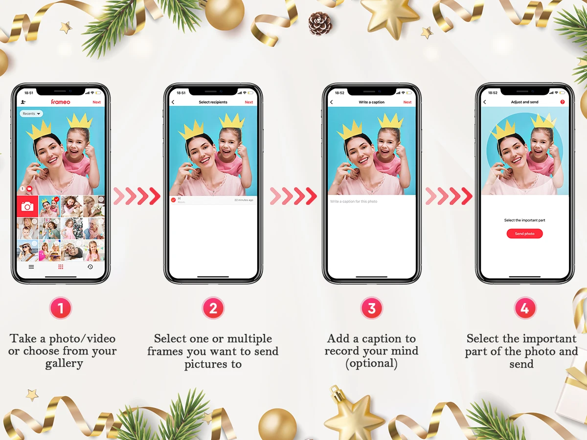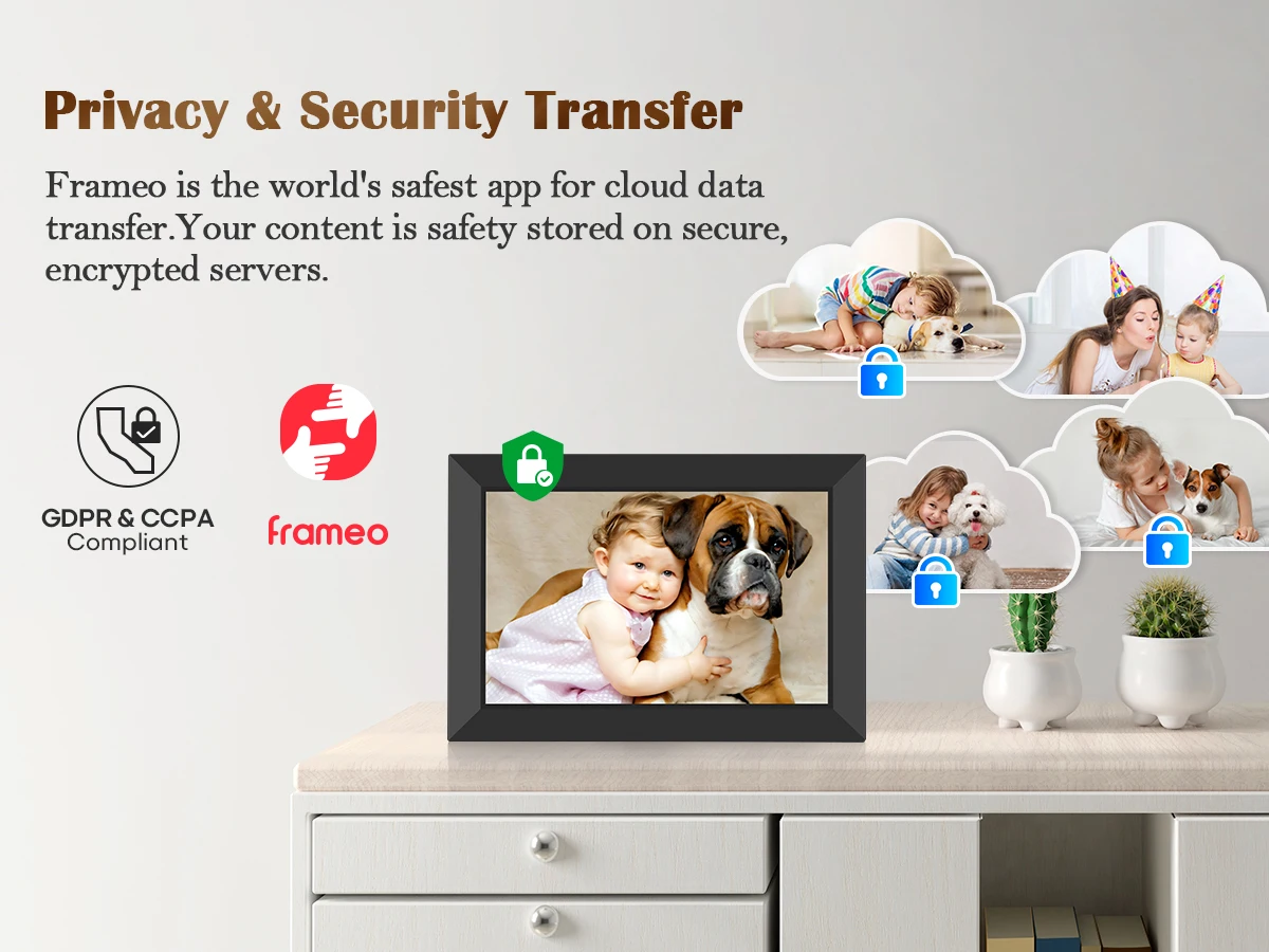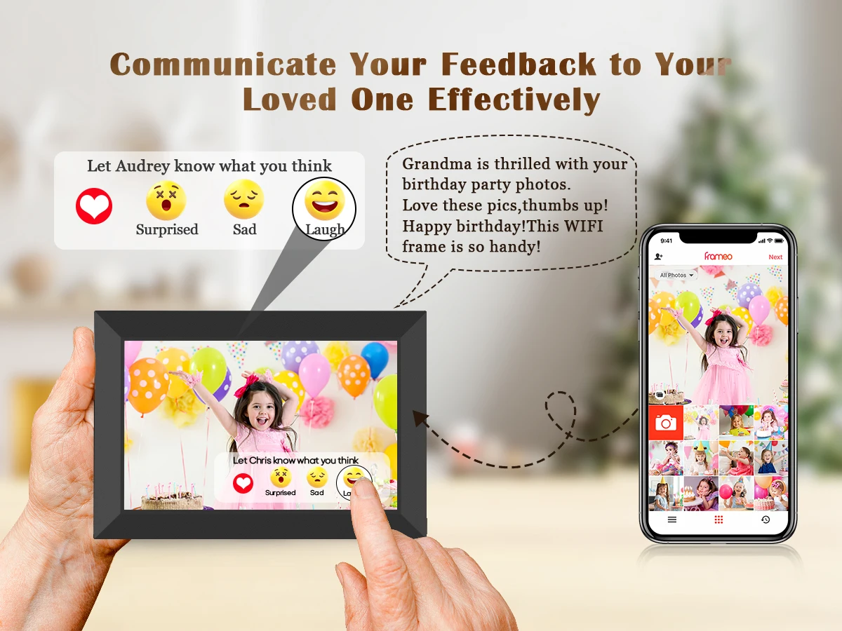 Avec le cadre photo numérique Wi-Fi 10,1″, recevez instantanément les photos/vidéos envoyées par vos proches via une application mobile. Écran IPS lumineux, mémoire intégrée et affichage portrait/paysage pour une déco moderne et vivante. Le cadeau idéal pour les familles et les grands-parents.